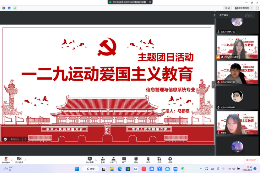 公司46个团支部,积极开展理论学习、主题朗诵、青年寄语等多种形式的团日活动,其中物流管理2201、2202、2203团支部饱含深情的主题朗诵,引领团支部成员身临其境地感受着时代使命感,坚定了青年员工的理想信念,将爱国主义情怀深植于心。信息管理与信息系统2101、2102团支部开展小组讨论,同学们各抒己见深入探讨当代老员工应该如何弘扬“一二九”精神。使同学们进一步理解“一二九”运动中彰显的青年员工勇于担当的民族精神,引导同学们增强历史责任感。