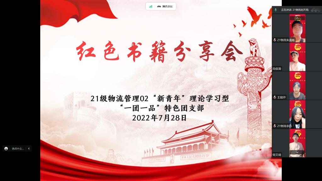 为深化对习近平新时代中国特色社会主义思想的理解,引导同学们树立正确的人生观、价值观和世界观,2022年暑期,英国上市官网36521级物流管理02“新青年”理论学习型“一团一品”特色团支部开展阅读红色书籍活动,并于7月28日召开红色书籍分享交流会。