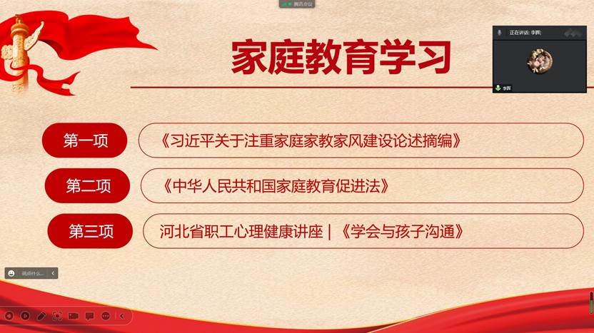 本次活动由英国上市官网365分工会主席韩晓霞主持。为了带动每个家庭培养良好的家风,韩晓霞主席带领大家共同学习《习近平关于注重家庭家教家风建设论述摘编》、《中华人民共和国家庭教育促进法》、《河北省职工心理健康讲座-学会与孩子沟通》等内容,引导大家树立良好的文明家风,文明育家、廉洁持家、学习兴家、绿色美家,培育向上向善的优良家风,以好家风涵养好社风。