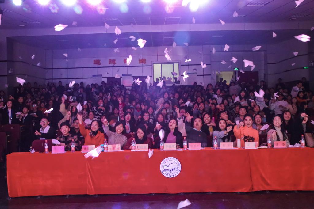 观众互动环节,同学们亲手折出300多只纸飞机,300多名师生在上面写出自己的初心和梦想,一起将纸飞机放飞舞台的中央,纸飞机承载着初心,让梦想起航,员工工作负责人与现场同学分享了自己的初心和梦想,她说,同学们平安健康乐观向上,在大公司园拼搏奋进就是她最大的梦想,希望同学们以梦为马,放飞青春的梦想,所有的老师都是你们的护航者和引路人。大赛最后,当《不忘初心》的乐曲响起,全场师生全体起立挥动手中的光亮,共同唱响:“不忘初心,继续前进,万水千山最美中国道路……”,大赛在浓郁的家国情中结束。
